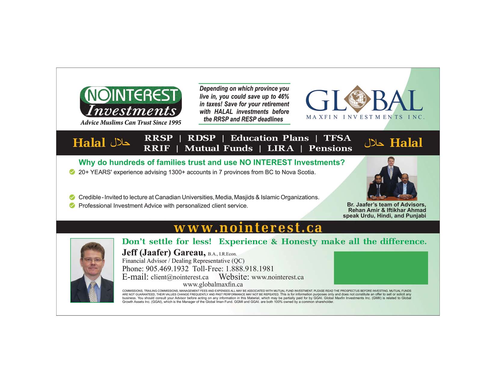 Since 1995, Jeff (Jaafer) Gareau and NO INTEREST Investments have been advising hundreds of clients pertaining to Islamic Investments that meet strict Islamic Criteria for HALAL RRSP - HALAL