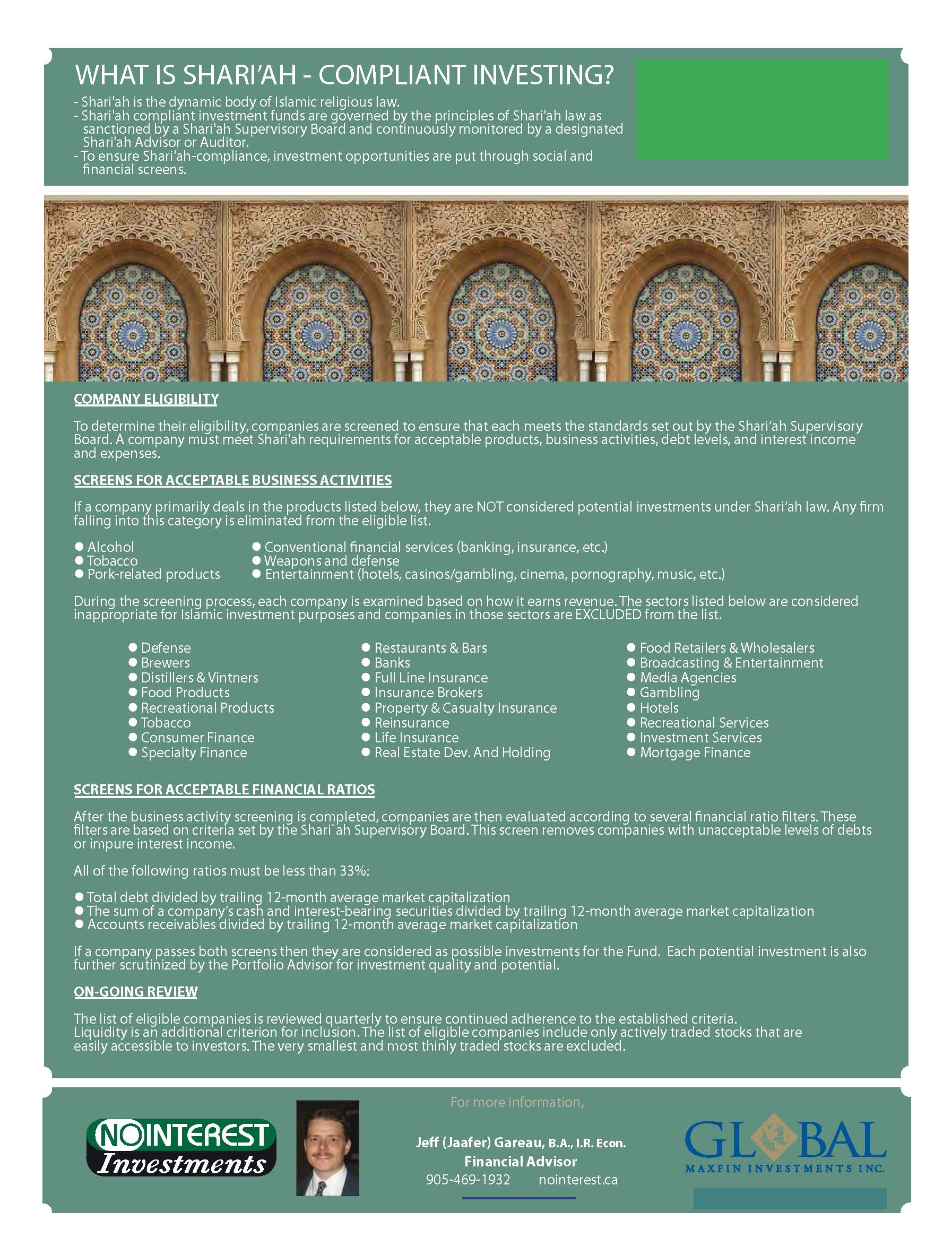 Since 1995, Jeff (Jaafer) Gareau and NO INTEREST Investments have been advising hundreds of clients pertaining to Islamic Investments that meet strict Islamic Criteria for HALAL RRSP - HALAL